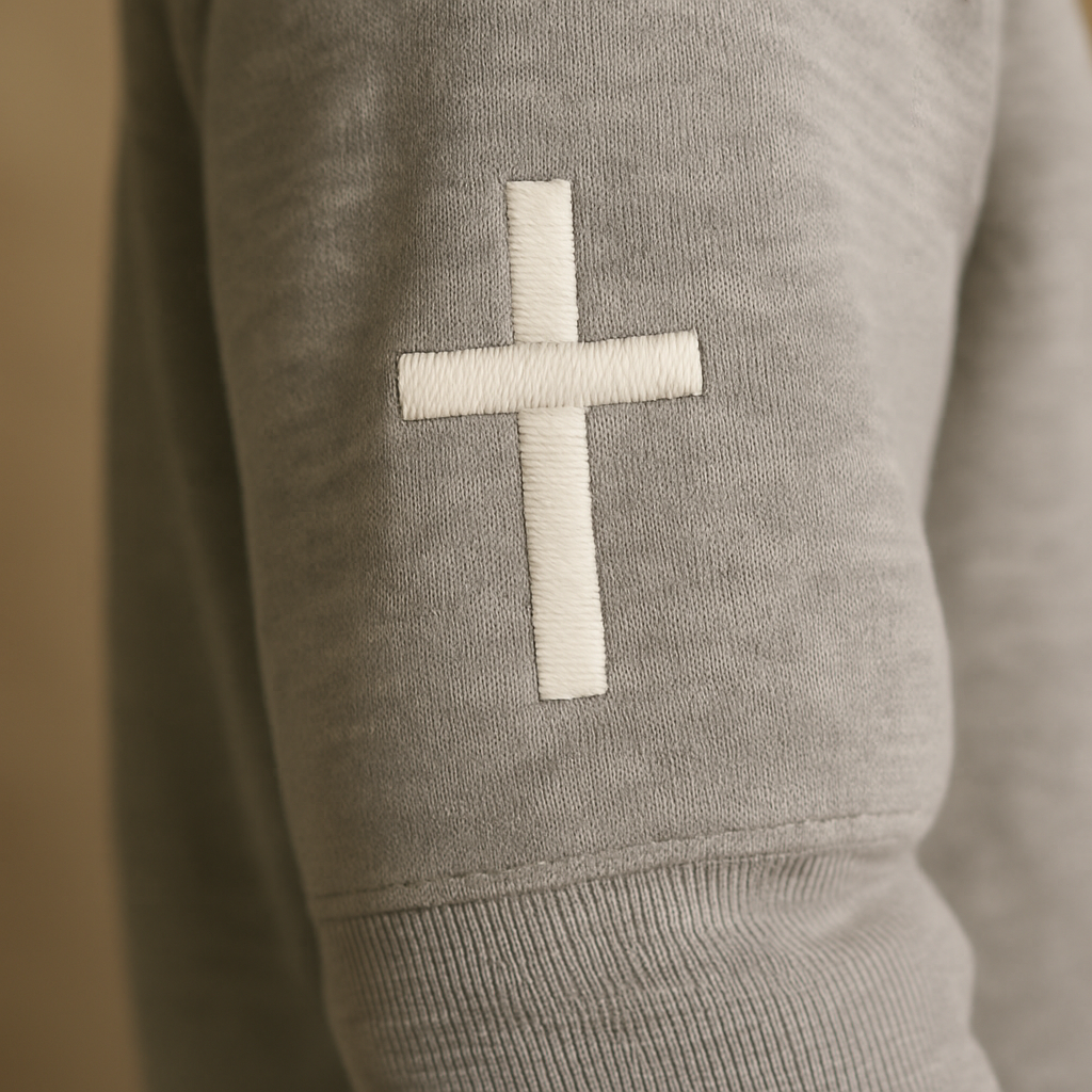 Featuring bold front lettering, a custom embroidered cross on the right cuff, and Colossians 3:23 embroidered on the left cuff, this piece blends meaning with style. Each detail is designed to inspire discipline and purpose — a quiet reminder that your work, your grind, and your faith matter.